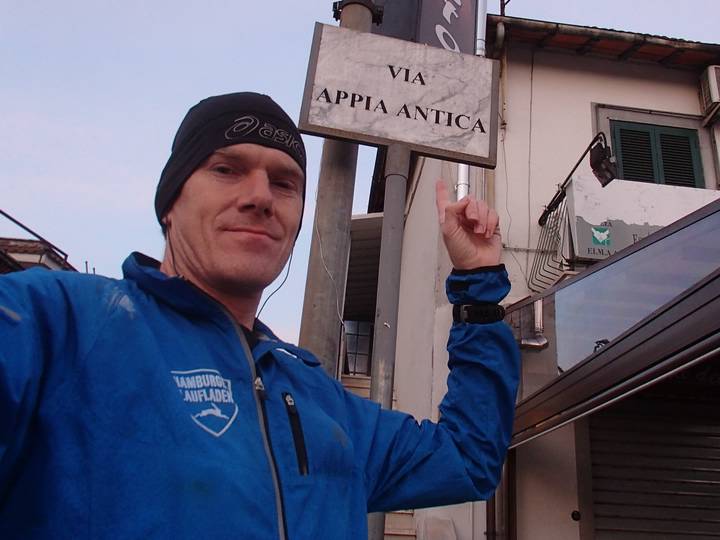 Via Appia Antica / Frattocchie 6.05 Uhr Bevor es wieder ans Laufen ging schnell noch ein Foto als Beweis, daß ich tatsächlich da war. |