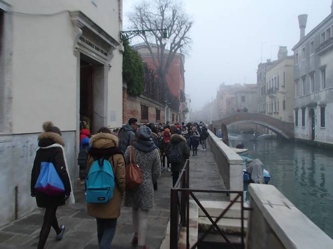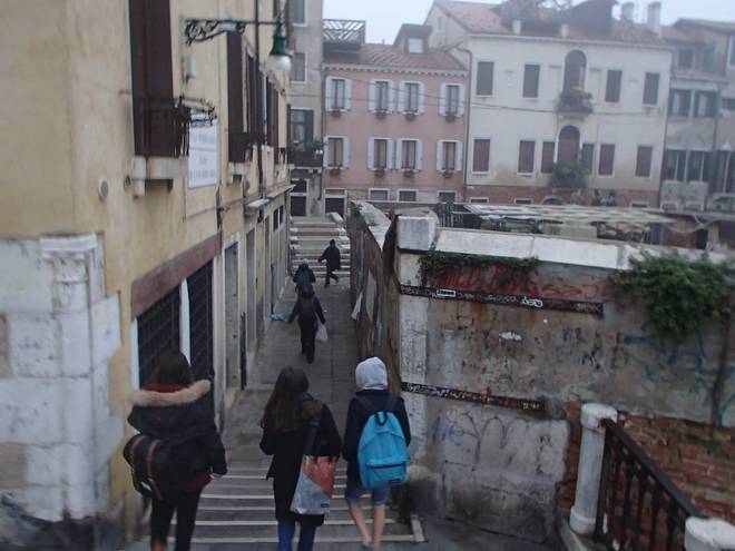 Fondamenta Santa Caterina Rio di Santa Caterina Jede Menge Schulkinder auf dem Weg und natürlich alle langsamer als ich. Dazu gab es am Eingang zur Schule eine Einlaßkontrolle. Das beschleunigte die Sache auch nicht. |