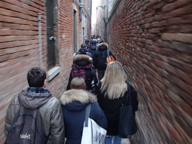 Calle del Tedeum Nun wurde es kompliziert was das Orientieren anging. Hatte ich bisher immerhin noch Kanäle gehabt, um meinen Weg abzusichern, galt es nun, 26 richtige Abzweigungen auf nur 600 Metern Wegstrecke zu finden. Im Schnitt alle 8,3 Sekunden eine Kurve. Und das nur zwischen Gebäuden. |