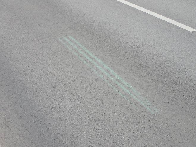 Grunerstraße 12.19 Uhr Grüne Striche auf der Straße. Die gehören wohl zur Strecke des Halbmarathons. Jedenfalls nicht zum Marathon, denn der führt hier nicht vorbei. |