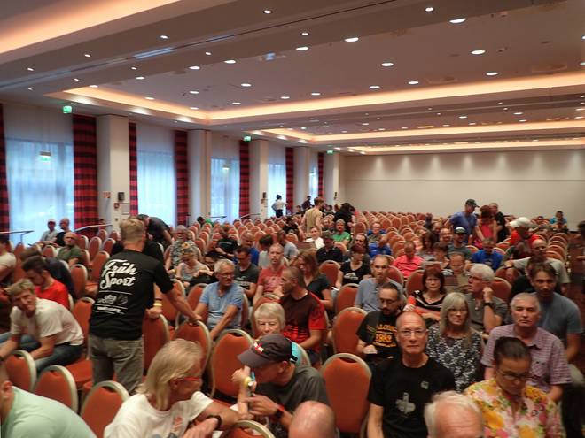 Hotel H2 am Alexanderplatz 17.09 Uhr Abgesehen davon, daß die Warteschlange sehr lang war, ging alles reibungslos. Auch daß meine Fahrrad-Begleitung nicht dabei sein konnte (hatte einen Autounfall... aber nur Blechschaden... und auch nur am Auto), war kein Problem. |
