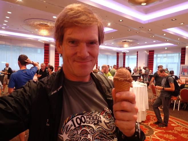 Hotel H2 am Alexanderplatz 18.57 Uhr Nach dem Briefing ging es zurück zur Pasta-Party. Da gab es noch Eis zum Kosten. Eis zur Pasta-Party hatte ich noch nie. In Lissabon wurde nach dem Lauf Eis verteilt, aber schon vorher? |
