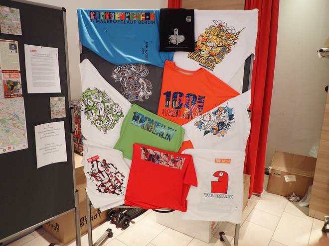 Hotel H2 am Alexanderplatz 19.45 Uhr Ein hübsche Sammlung von Finisher- und Volunteer-Shirt der Vorjahre. Eines davon hatte ich auch schon. |