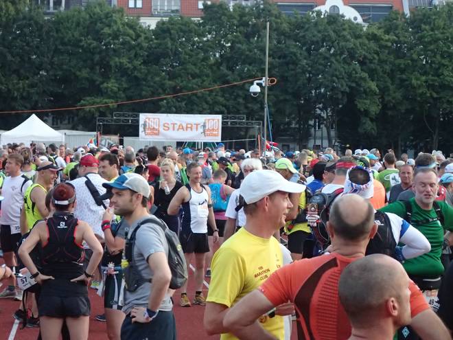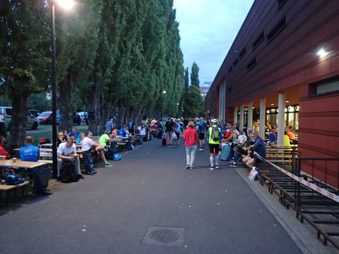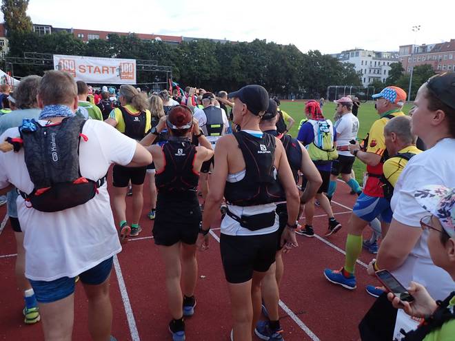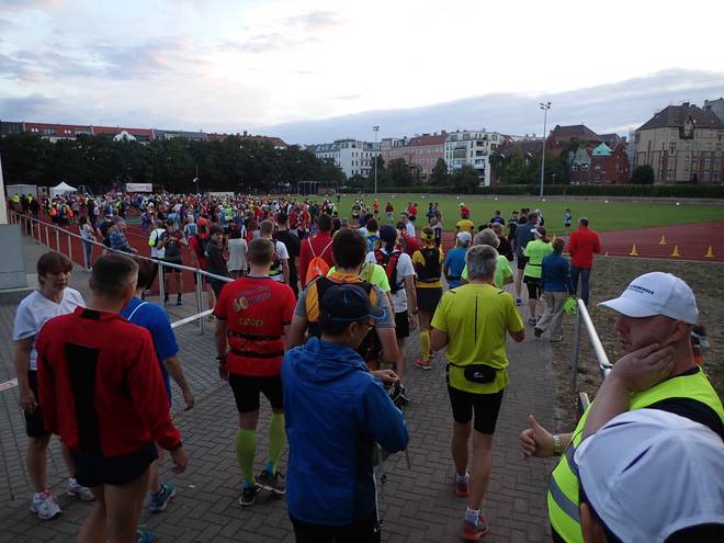 Friedrich-Ludwig-Jahn-Sportpark 5.56 Uhr Das Wetter war okay. Schon 16°C am Start. Später würden es 24°C werden. Nicht gerade wenig, aber drei Tage zuvor waren es noch 38°C in Berlin gewesen und zwei Tage nach dem Lauf 32°C. Also konnten wir nicht meckern. |