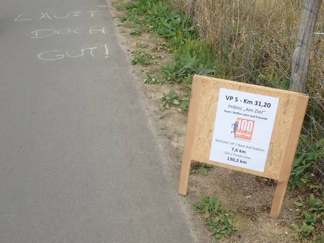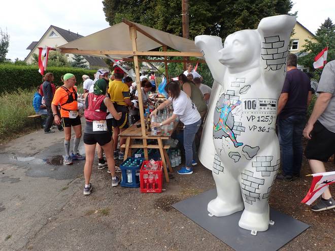 Grenzweg VP6 - Buckow 10.45 Uhr / Km 39 Endlich war er da. Der sechste Verpflegungsstand. Nun ging das Rechnen wieder los. 7,6 Kilometer für 57 Minuten. Wieder genau 7:30 Min/Km. Klang gut. Ab Beginn war ich mit 7:20 Min/Km unterwegs. Alles im grünen Bereich. |
