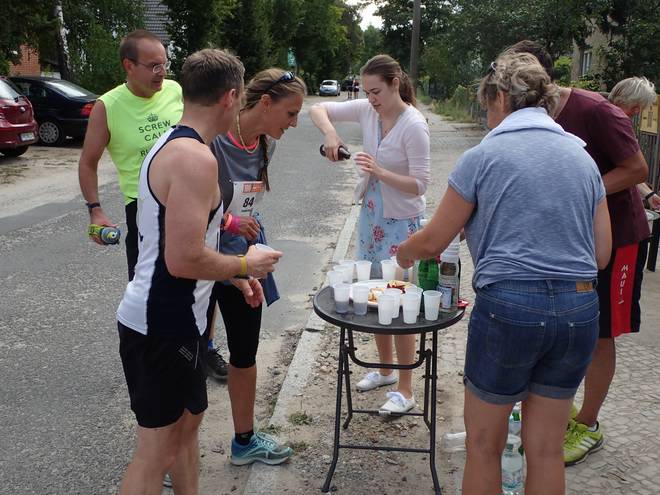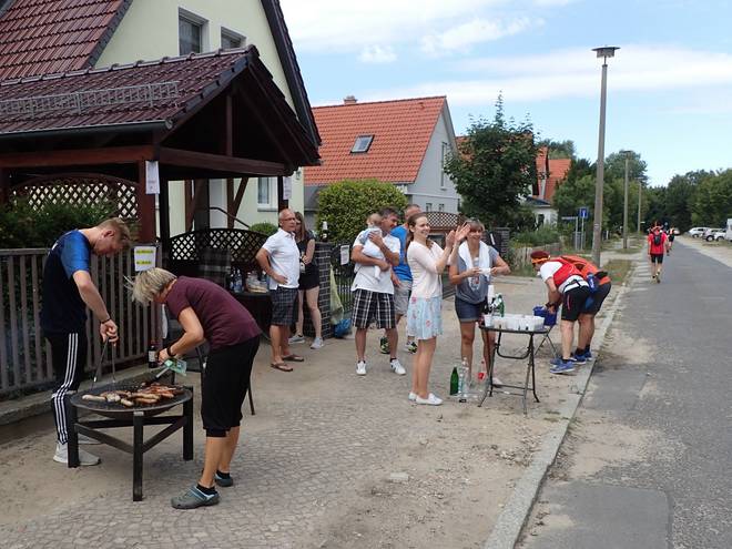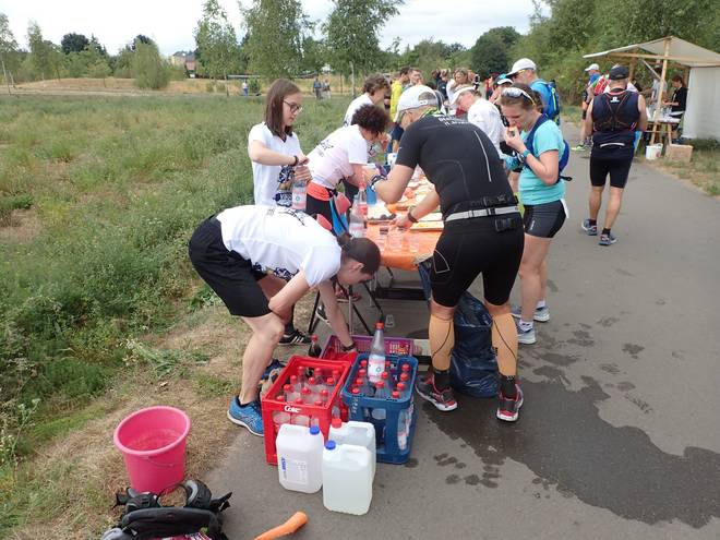 Wolziger Zeile VP7 - Nina's Eltern 11.47 Uhr / Km 46,5 Und während ich noch hier am Verpflegungsstand meine Wasservorräte auffüllte, kam ich unter das Gesamt-Tempo von 8 Km/h. Irgendwann war damit zu rechnen, aber doch nicht so früh. |