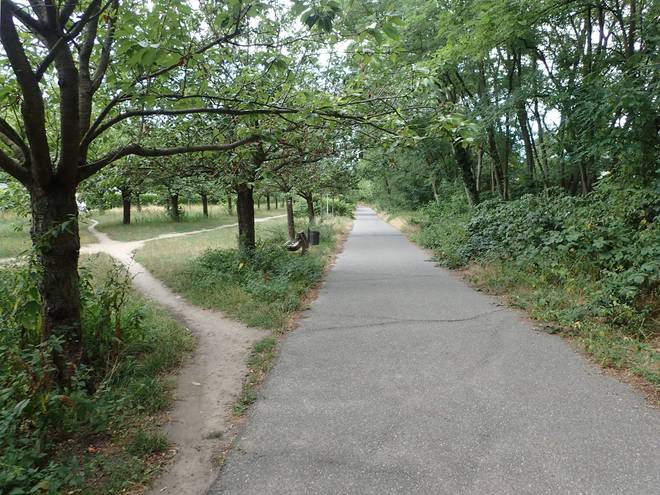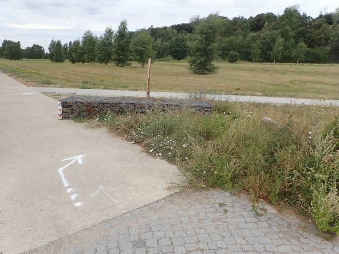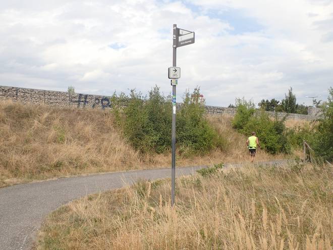 Kirschblütenallee 12.56 Uhr / Km 54 Die Mauerweglauf-Strecke ist eigentlich idiotensicher mit Pfeilen markiert. Aber hier fehlte einmal ein Pfeil... |