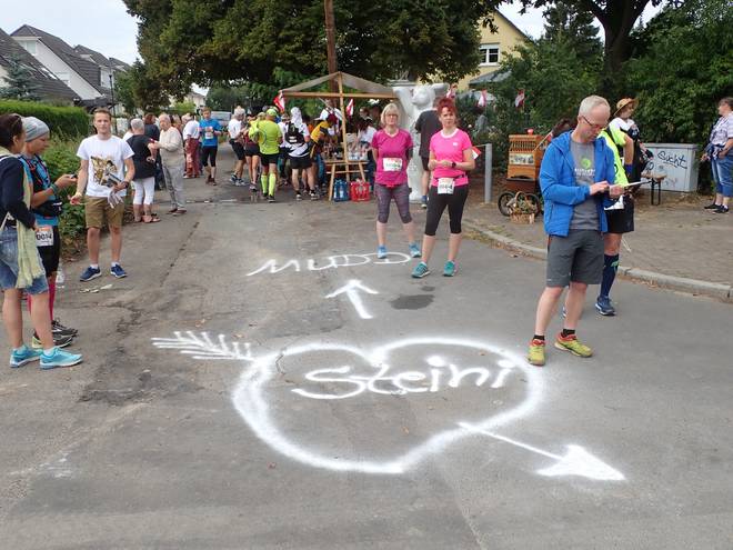 Rudower Höhe 9.30 Uhr / Km 29 Die größte Änderung der Strecke gegenüber 2017 gab es hier. Statt am Bahnhof Rodow vorbei, wo man im Vorjahr die Läufer mit Wasserbomben attackierte, lief man nun über die Rudower Höhe. Da gab es mehr Höhenmeter, aber keine Wasserbomben. |