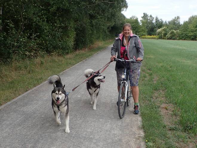 Großziethen 10.57 Uhr / Km 40 Einer dieser beiden Hunde war mit mir auf dem Foto. Und auf dem Fahrrad die Fotografin und meine spätere Radbegleitung Romy. Die Fahrradbegleitung war erst ab Teltow (Km 57,2) erlaubt. 2017 schon ab Km 34. Das gefiel mir weitaus besser. |