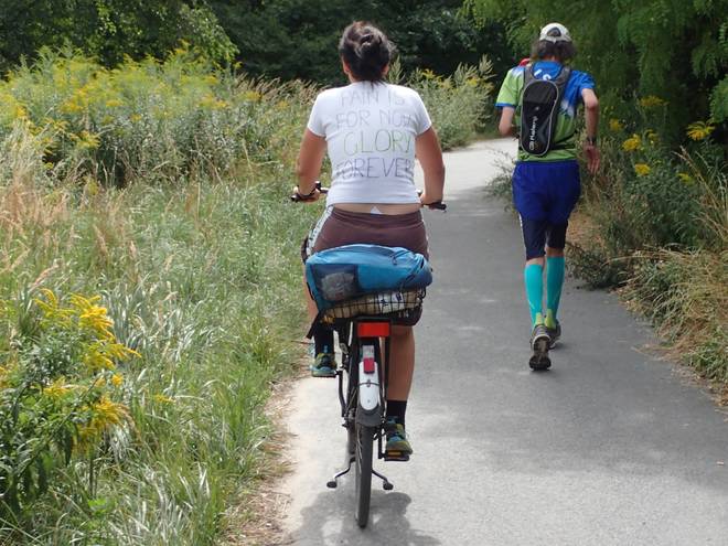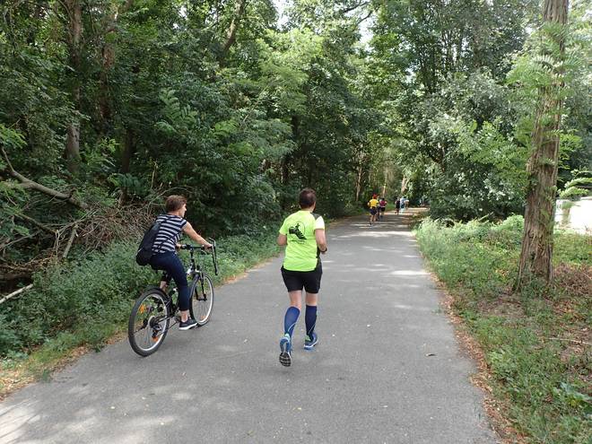 Großziethen 11.14 Uhr / Km 42 Fahrradbegleitung war zwar noch nicht erlaubt, aber es fanden sich immer wieder Radfahrer, die gemütlich mit Läufern mitfuhren. Nun halt ohne die Startnummer, die man als Fahrradbegleitung bekam. |