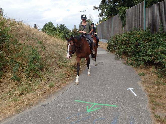Marienfelde 12.18 Uhr / Km 50 Ob ich auf einem Pferd wohl schneller unterwegs gewesen wäre. Vermutlich nicht. Aus Erfahrung weiß ich, daß ich Reiter immer überhole. |