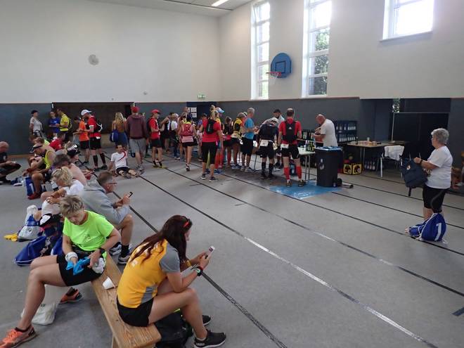 VP9/WP1 - Sportplatz Teltow 13.37 Uhr / Km 59,2 59,2 Kilometer in 7:37 Stunden machte 7:43 Min/Km. Jetzt noch 102,2 Kilometer in 16:17 Stunden für die Gürtelschnalle, die man für ein Finish unter 24 Stunden bekam. Das entsprach 9:33 Min/Km. Das klang doch machbar. |