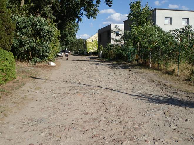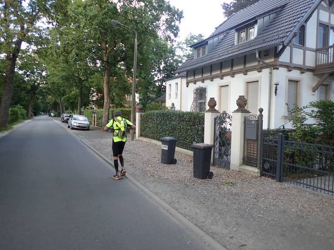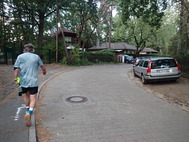 Kladower Straße 18.51 Uhr / Km 91,6 Schritt für Schritt quälte ich mich weiter. Alles tat weh. Vor allem die Füße und Beine. Die Knie, die Hüften und meine rechte Schulter machten sich aber auch bemerkbar. |