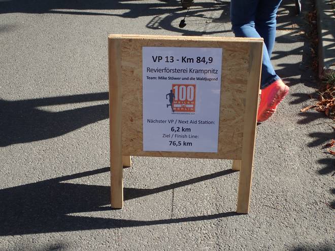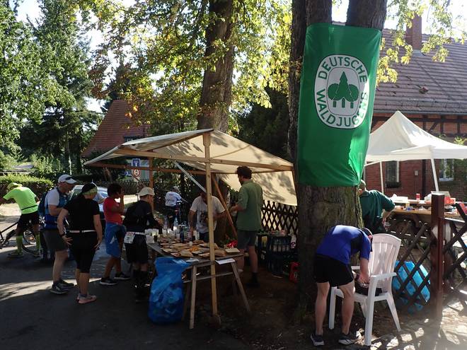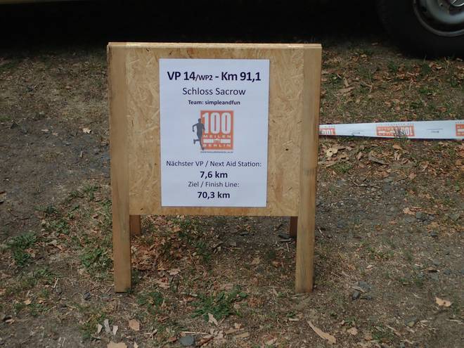 Rotkehlchenweg VP13 - Revierförsterei Krampnitz 17.25 Uhr / Km 84,9 Während ich hier einen Becher nach dem anderen trank, hielt ein Auto an, dessen älterer Fahrer sich lautstark über die Läufer aufregte, die auf der Straße unterwegs waren. Würden die noch da sein, wenn er zurückkäme, dann würde er keine Rücksicht mehr nehmen. Das wäre nicht sein Problem, sein Auto wäre schließlich haltbarer als die Läufer. |