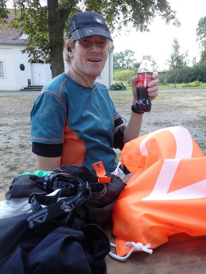 Schloßpark Sacrow 18.15 Uhr / Km 90 Und was besonderes wartete dort in meinem zweiten Beutel auf mich? Auch nichts tolles. Neues Iso-Pulver, Coca-Cola und ein Ersatzakku für meine Kamera. Vom Iso abgesehen, brauchte ich nichts wirklich. |