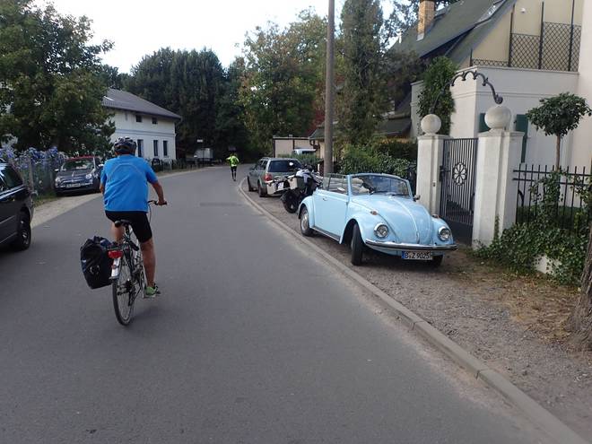 Glienicker Dorfstraße 19.44 Uhr / Km 97 Ich trank wieder den halben Liter Iso aus dem Rucksack. Das Anhalten war wieder keine gute Idee, aber der Rucksack klemmte nun mal auf dem Gepäckträger und da kam ich nicht im Gehen ran. |
