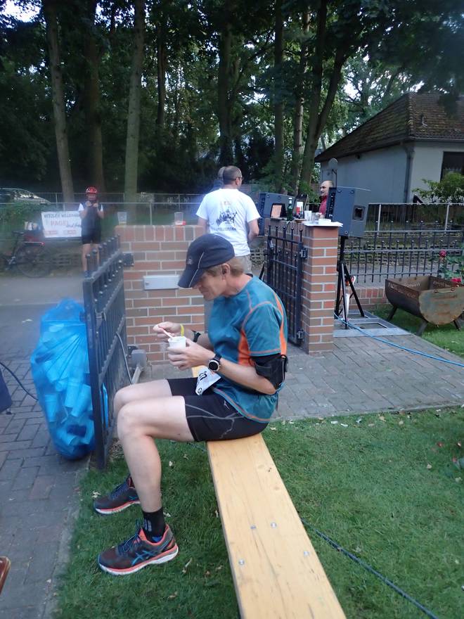 Kuckuckstraße VP15 - Pagel & Friends 20.03 Uhr / Km 98,7 Und ich saß schon wieder. Das war nicht gut und würde ganz sicher wieder große Probleme beim Weiterlaufen machen. Aber im Stehen hätte ich die Nudeln nicht essen können. So lange hätte ich nicht stehen können. |