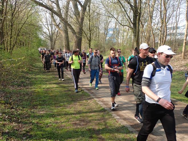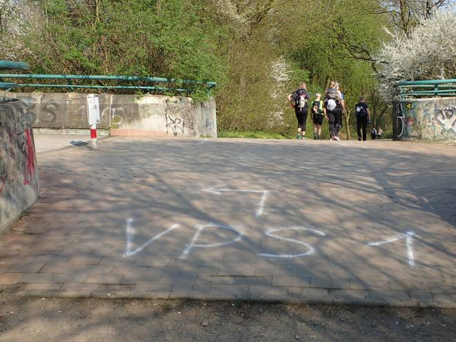Gottschalkring 16.34 Uhr / Km 17,6 Nun überholte ich die ersten Wanderer mit roten Bändern. Die kamen auch der 12.00-Uhr-Startgruppe. Vermutlich waren diese wie ich erst mit einem späteren Block auf die Strecke gekommen, aber auf 17,6 Kilometern hatte ich mächtig Boden gewonnen. |