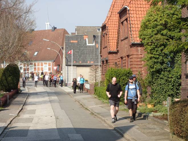Hein-Saß-Weg 14.25 Uhr / Km 0,4 Ich fing den MegaMarsch wandernd an. Sonst lief auch keiner was dazu führte, daß ich nach nur 200 Metern schon das Feld anführte. Ausgerechnet durch Finkenwerder, wo ich mich drei Wochen zuvor gleich zweimal verlaufen hatte. Aber zum Glück gab es nun noch ein paar Extra-Schilder. Da fand auch ich den Weg. |