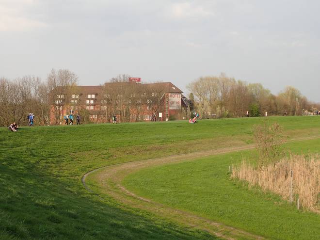 Billhorner Hauptdeich 17.48 Uhr / Km 27,7 Das Hotel da vorne könnte für spätere Läufer noch eine echte Verlockung werden. Wobei das bei miesem Wetter noch schlimmer wäre. |