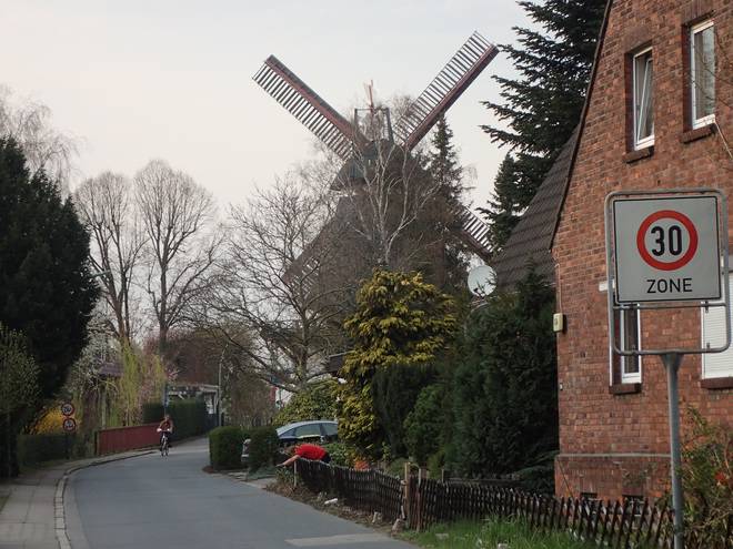 Kirchdorfer Straße Schönenfelder Straße 18.30 Uhr / Km 33,0 Der 2. Grüne Ring führte hier entlang zu Wilhelmsburger Windmühle Johanna aus dem Jahre 1875. |