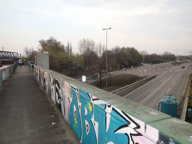 Schlachthofbrücke 16.58 Uhr / Km 20,1 Oder genauer genommen über den Bahnhof hinweg. Am Bahnhof hätte ich mich zu trinken kaufen können. Aber der Bahnhof ist ziemlich groß und ich kannte mich hier nicht gut ais. Also lief ich weiter. |