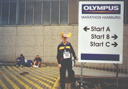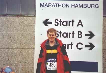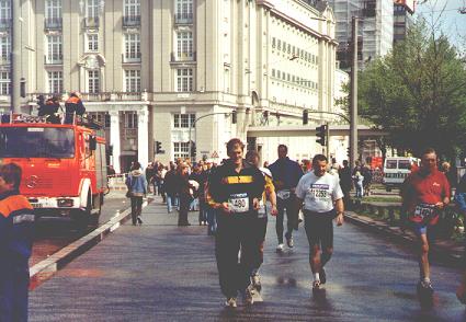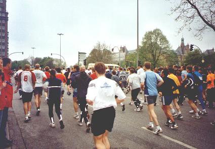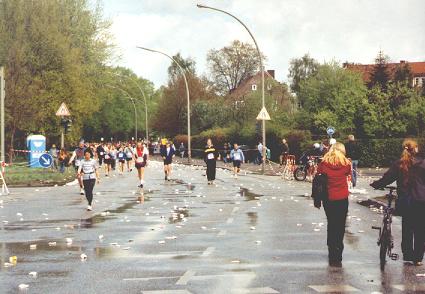Wenn da bei Kilometer 40 nicht plötzlich noch die zweite Luft (woher auch immer) gekommen wäre, es wäre der langsamste Marathon überhaupt geworden. So blieb ich mit 5:26 doch drei Minuten unter meinem Lauf vom Vorjahr. Allerdings neun Minuten über meinem Rekord von 2000. Wenn man bei Kilometer 38 die Rothenbaumchaussee entlang läuft, es regnet wie im Gewitter, weit und breit kein Mitläufer und die einzigen Zuschauer sind zwei Polizisten in ihrem Peterwagen... dann fragt man sich wirklich, wie blöde man eigentlich sein muß, um bei so was mit zu machen. |