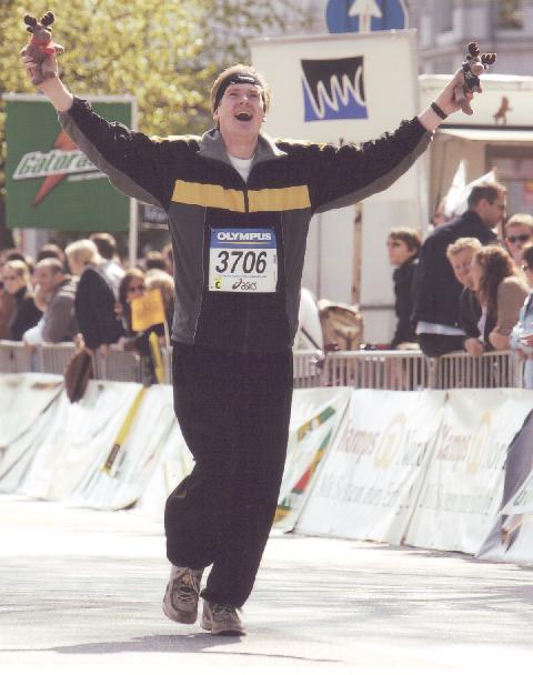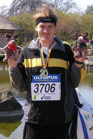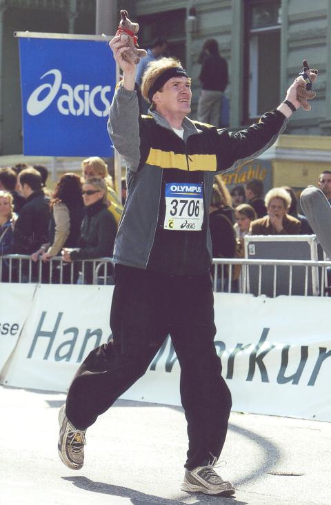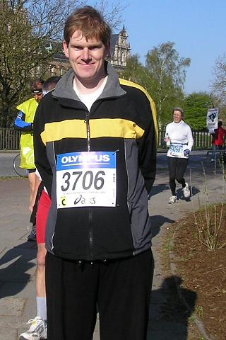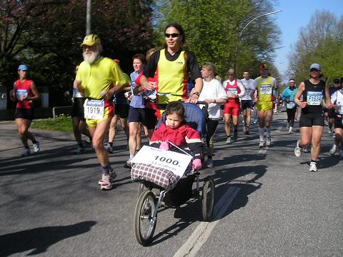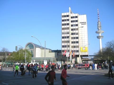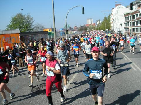 Am 24. April 2005 war es also mal wieder soweit. Ganz Hamburg war mit bunten Schildern "Laufstrecke" und weiß-roten Signalbänden verziert und auf 42,195 Kilometern Straße waren kleine blaue Striche aufgemalt: Es war mal wieder Marathon-Tag. Bei bestem Sonnenwetter und 8°C Starttemperatur sowie einer Tages- höchsttemperatur von 14°C starteten rund 19.000 Läufer an den Messehallen zu ihrem Lauf. Es waren mehr Läufer als jemals zuvor am Start. Aber dennoch klappte die Organisation dank unzähliger freiwilliger Helfer reibungslos. |