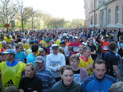 Die Anspannung kurz vor dem Start. Hier in Block C/Ost wird 15 Minuten nach dem Hauptfeld gestartet. Die letzten Läufer kommen so mit rund 20 Minuten Verspätung über die Startlinie. Aber keine Panik, gemessen wird die Netto-Zeit. |