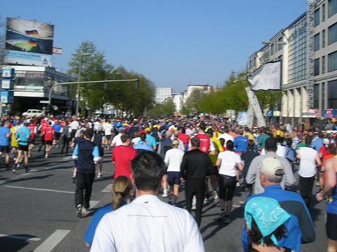 Kilometer 29: Rathenaustraße Mehr und mehr fällt das Feld auseinander und immer mehr Läufer werden zu "Gehern". Noch geht es mir ganz gut. Die Beine sind noch nicht zu müde. Aber ich nehme nicht genug Zucker zu mir. Irgendetwas ist nicht, wie es sollte. Im Kopf düselt es und der Magen will nichts mehr zu sich nehmen. Melden sich jetzt doch die Nachwehen der Grippe? |