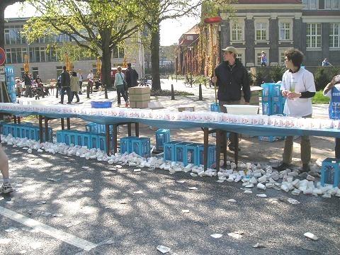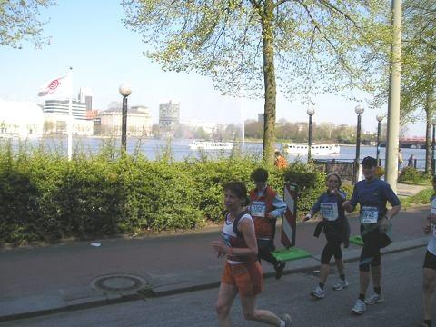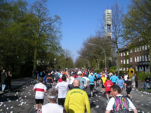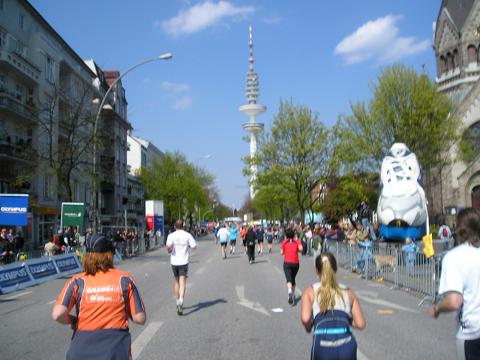 Kilometer 40: Rothenbaumchaussee Hier im Rücken der Universität stand der letzte Verpflegungs- stand vor dem Ziel. Und kommt die Zeit, wo die Vorfreude über den bevorstehenden Triumph die Schmerzen überdeckt. Es geht wieder etwas leichter voran. |