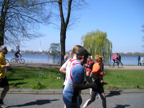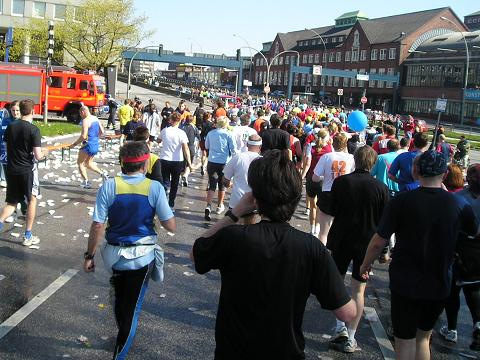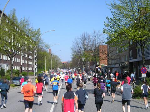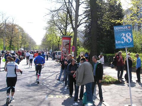 Kilometer 38: Rothenbaumchaussee Jetzt wurde es ganz hart für mich. Der Einbruch kam zwar viel später als in früheren Jahren, war aber kein bißchen angenehmer. Beine, Magen, Füße, Kopf... nichts wollte mehr wirklich weiterlaufen. Aber es waren ja nur noch 4 Kilometer. Viel zu spät zum Aufgeben. Also ganz langsam weiter... |