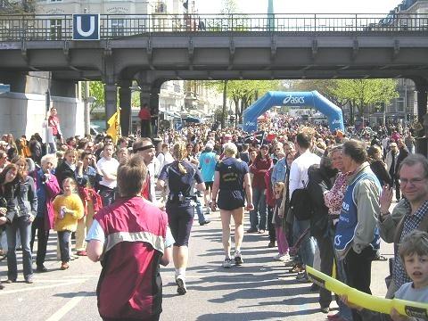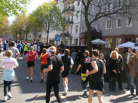 Kilometer 37,7: Eppendorfer Baum/ Klosterstern Der heimliche Höhepunkt der Strecke. Die Stimmung, die hier bis zum Ende hin verbreitet wird ist einfach gigantisch. Die Polizei zählte alleine an diesem Punkt 20.000 (!!) Zuschauer. Insgesamt waren es 700.000!!! Kein Wunder also, daß die TV- Live-Übertragung eine eher schlechte Einschaltquote in Hamburg hatte. |