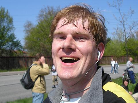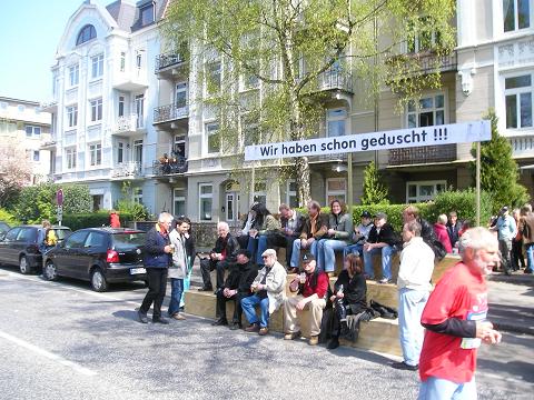 Kilometer 36: Tarpenbekstraße Diese fröhlichen Leute sitzen hier jedes Jahr auf der selbst gebauten Tribüne. Auch wenn die ersten Läufer schon seit über zwei einhalb Stunden im Ziel sind, glaube ich nicht, daß hier "echte" Marathon-Läufer sitzen. :-) |