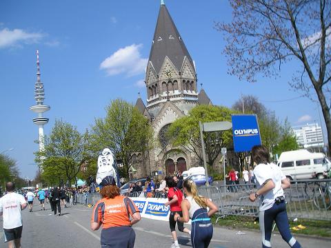 Kilometer 5: Bernadottestraße mit der St. Ansgar-Kirche Bis zum ersten Verpflegungs- stand lag ich deutlich unter meiner Wunschzeit. Statt eines 6:40 Min/Km-Schnittes waren es 7:00 Min/Km. Aber dafür, daß ich wegen einer Grippe zuvor kaum trainieren konnte, ging es ganz gut. |