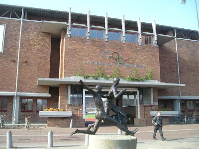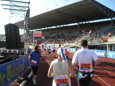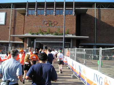 Olympisch Stadion Der Start findet im alten Olympia-Stadion statt. Auf der großen Videoleinwand die Bilder des holländischen Fernsehsenders NOS. Das Wetter was genial. Hätte ich es mir selbst wünschen dürfen, hätte ich mehr Fehler gemacht. Sonne, wenig Wind, 16°C und das mehr oder weniger von Start bis ins Ziel. |