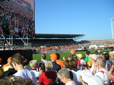 Geschafft. Noch etwas müde genoß ich die phantastische Stimmung um mich herum. Anders als bei anderen Läufen zog es mich gar nicht so schnell in die Kleiderkammer zu meinen Sachen. Hier wollte ich gar nicht mehr raus aus dem Stadion. |