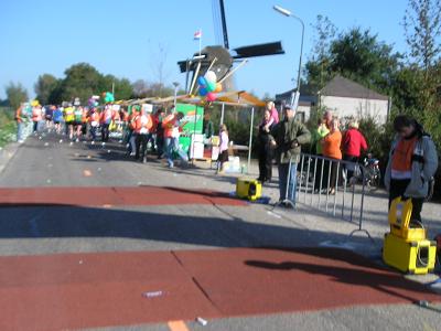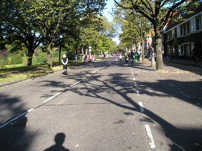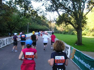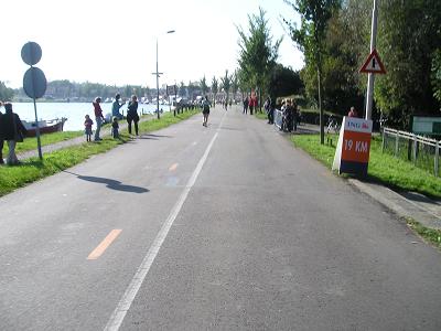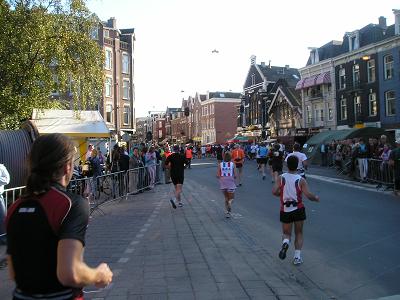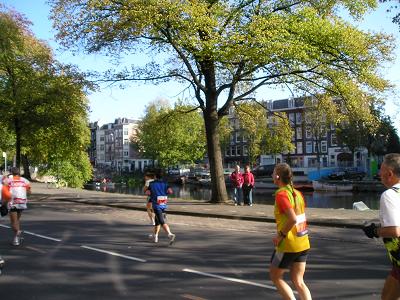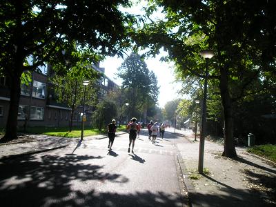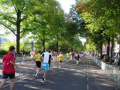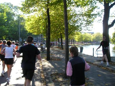 Nun ging es gut vier Kilometer die Singelgracht entlang. Und auf der Straße wurde es eng. Die Halbmarathonläufer hatten das Feld der langsamen Marathonläufer eingeholt und bestimmten nun den Lauf. In großer Masse flogen sie an den paar einzelnen Marathonläufern vorbei. Auch wenn man sich ganz am Rand aufhielt hatte man keine echte Ruhe und wurde ständig angerempelt. |