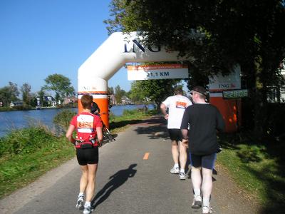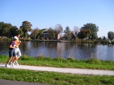 Mal abgesehen vom Stadion war das hier die mit Abstand schönste Laufstrecke. Neun Kilometer lang ging es die Amstel entlang. Auf der gegenüber liegenden Uferseite zog sich ebenfalls ein endloser Läuferstrom das Ufer entlang. Die waren allerdings schon ein paar Kilometer weiter als ich. |