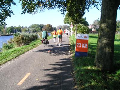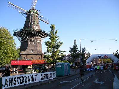 An der Windmühle waren wir schon bei Kilometer 15,3 vorbeigelaufen. Es ist der Punkt, an dem wir die Amstel erreicht hatten. Noch war ich joggend unterwegs, aber nun wurde es immer schwerer, die Beine zu bewegen. Dazu der Durst und der nächste Verpflegungsstand war erst bei Kilometer 26!! |
