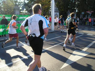 Um 11 Uhr dann der Start. Schon da hatte ich das erste Mal den Verdacht, daß es wohl doch nicht die angekündigte Anzahl von 20.000 Läufern sein würde. Es dauerte nämlich nur sieben (!!) Minuten, bis auch der letzte Läufer über die Startlinie war. Zum Vergleich: In Köln dauert es mehr als 45 Minuten für 17.000 Läufer. |