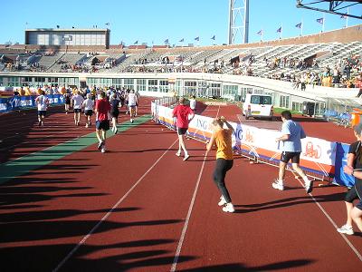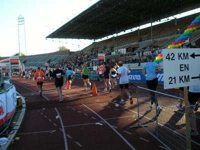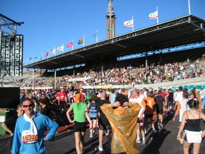 Das sind dann die Momente, an denen man die Qualen und Probleme der letzten fast fünfeinhalb Stunden völlig vergißt. Wohl nicht zuletzt auch wegen der vielen Halbmarathonläufer war das Stadion immer noch gut gefüllt. Die Stimmung und das Gefühl, hier finishen zu dürfen ist einfach nur genial. |