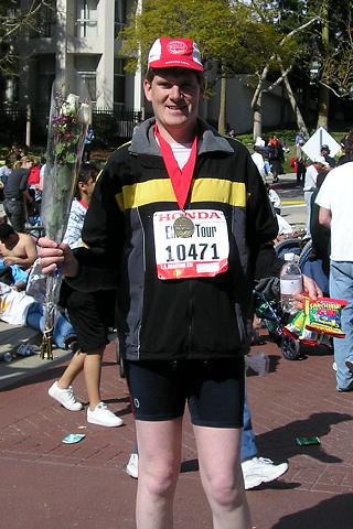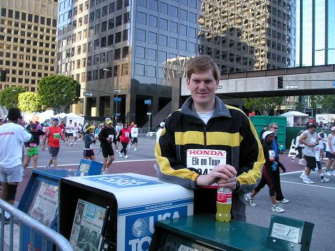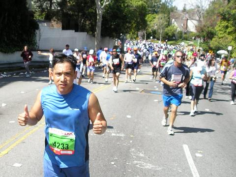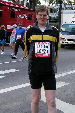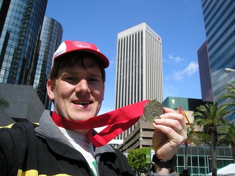 Street & Flower Street 13.54 Uhr - Meile 26,2 Geschafft!!!! Falko, seine 9. Medaille und der Bank of America Tower in Hintergrund. Meine Zeit war durchschnittlich für mich. Bei anderen Läufen liege ich damit unter den letzten ein bis zwei Prozent. In Los Angeles gehörte ich fast noch zu der schnellsten Hälfte, wurde 10192. von 20308 Finishern. Der letzte Läufer überquerte die Ziellinie nach 14:54:16 Stunden. Das war dann um 23.11 Uhr. |
