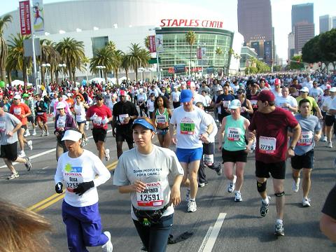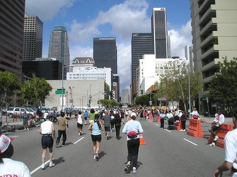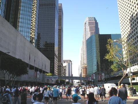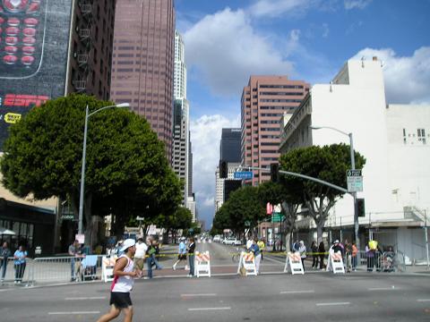Street 8.37 Uhr - Meile 1 Kurz nach dem Start ging es am Convention Center und dem bei Basketball-Fans bekannten Staples-Center (LA Lakers) vorbei. Im Hintergrund sind noch die Türme der Downtown zu sehen. |