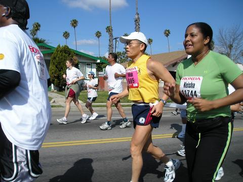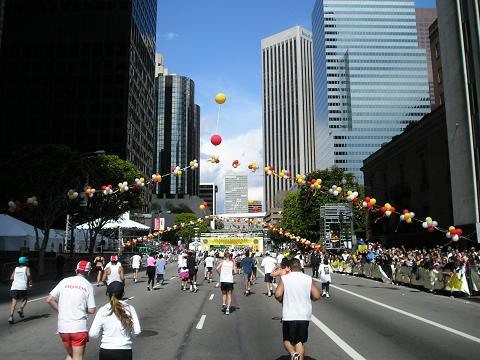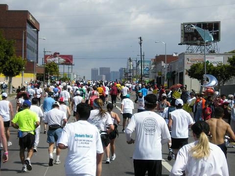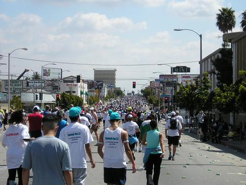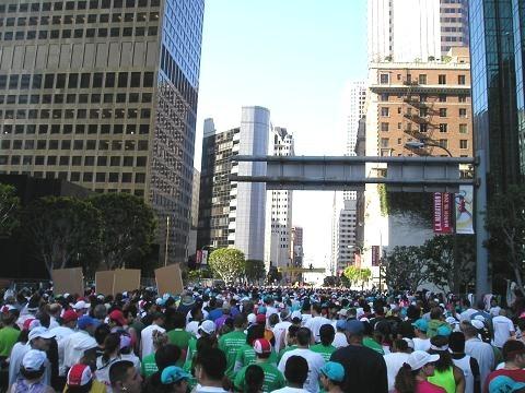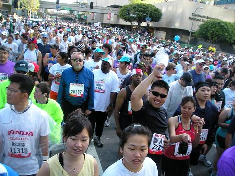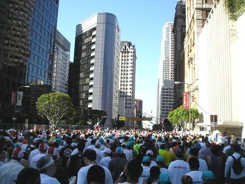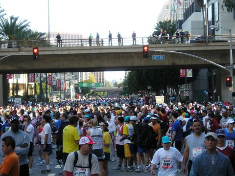 Street & Firueroa Street 8.23 Uhr - Meile 0,0 Das Starterfeld war sehr bunt. Das lag wohl auch daran, daß es in Los Angeles kein echtes Zeitlimit gibt. Allerdings: Nach 6 Stunden werden die Straßen wieder geöffnet und man muß ohne Verpflegungsstände auf dem Bürgersteig weiterlaufen. |