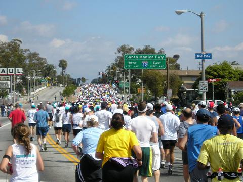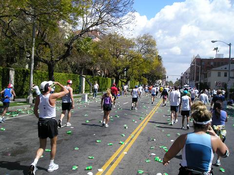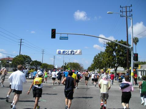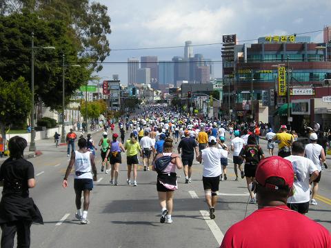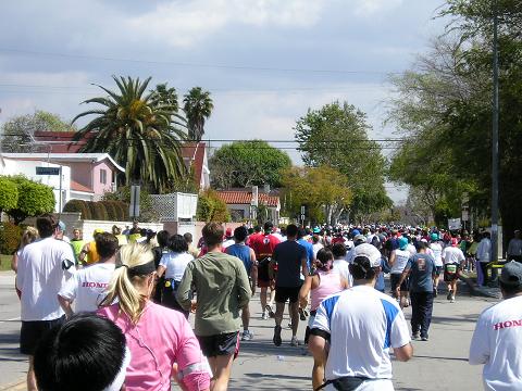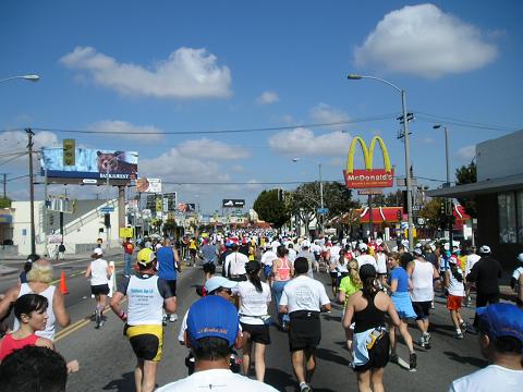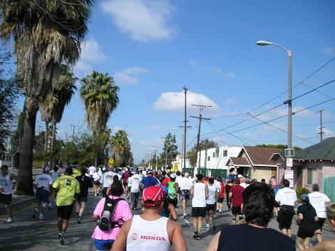 Boulevard 11.12 Uhr - Meile 15 Ein endloser Läuferstrom zog sich auch knapp drei Stunden nach dem Start durch die Straßen von Los Angeles. Bis hier ging es mir noch sehr gut. |