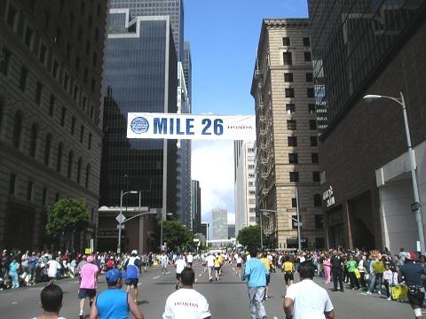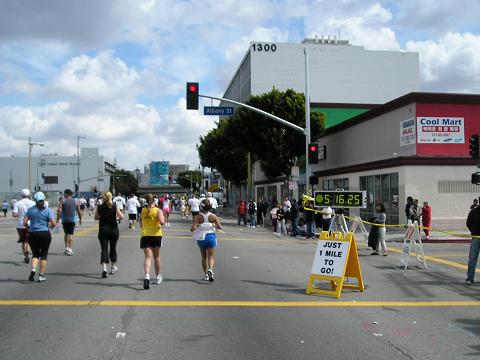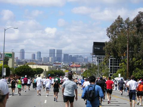 Boulevard 12.51 Uhr - Meile 22,5 Noch eine Kurve bis zum Ziel. In der Ferne ist Downtown zu sehen. Da geht es hin. Aber das ist noch weit, da eine Meile eben mehr ist als ein Kilometer (1 Meile = 1,608 Kilometer). Und der Olympic Boulevard bietet 3,5 Meilen Laufstrecke. |
