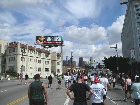 Boulevard 12.59 Uhr - Meile 23 Jetzt ging es durch Koreatown. Das bedeutete, daß es kaum noch englische Werbetafeln und Ladenschilder gab. Man kam sich wirklich vor wie in Asien. |