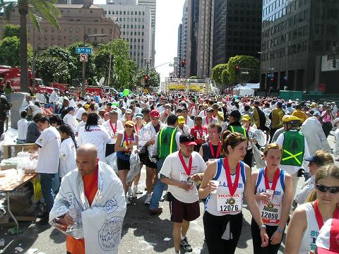 Street 13.51 Uhr - Meile 26,1 Endlich das Ziel in Sicht. Zwei Stunden hatte ich mich gehend mit der Blase herumgequält, war alleine eine lange Stunde auf dem Olympic Boulevard unterwegs. Jetzt war ich nicht mehr in der Lage, für das Ziel noch ein paar Schritte zu joggen. So ging ich langsam, ach 5:25:06 Stunden durchs Ziel. |