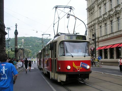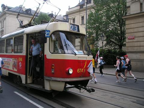 Kilometer 13: Národni / Nationaltheater Und wieder eine Straßenbahn an der Strecke. Ich wollte aber immer noch nicht mitfahren, auch wenn alle Wagons mit Marathon-Fahnen geschmückt waren. Erstaunlich, wenn man mal bedenkt, daß in der Prager und tschechischen Presse der Marathon nahezu gar nicht statt fand. |